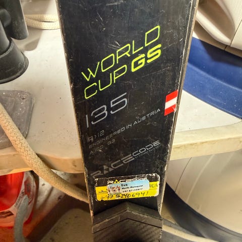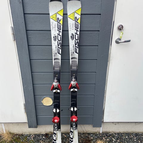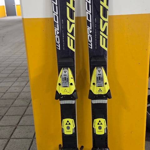 Fischer World Cup GS alpinski i lengde 180 cm. Modellen er en storslalåmski (GS) med Race Code-konstruksjon. Skiene har integrerte bindinger, som på bildene er montert på skiens midtparti. Farge hovedsakelig svart med gule detaljer.