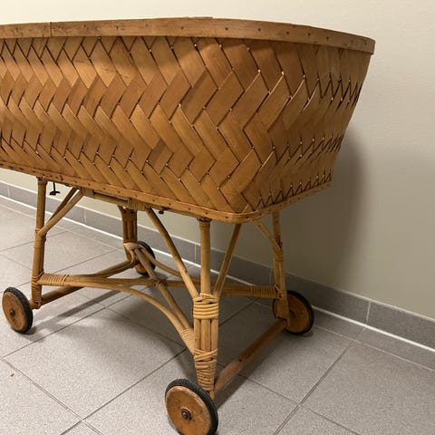 Håndmalt, antikk dukkeseng med motiv av to skiløpere.