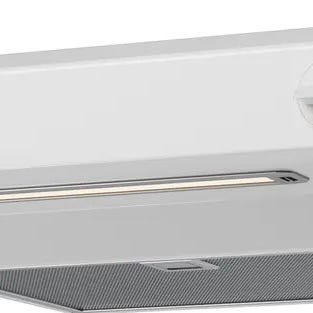Kjøkkenventilator fra IKEA veggmontert modell i hvit utførelse. Fronten er skråstilt for bedre hodeplass ved komfyren.