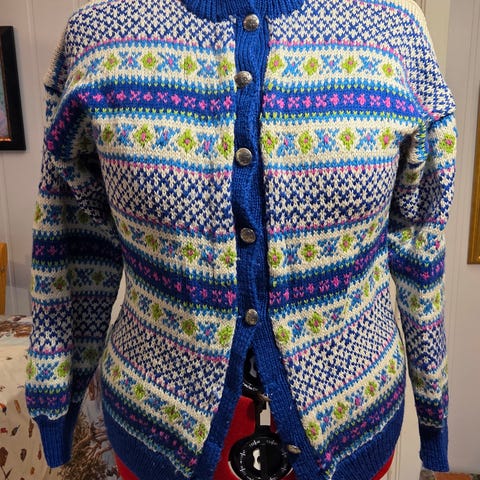 Strikkejakke i ull, flerfarget ca str S/M. Med tinnknapper. Jeg bruker M til vanlig og har den på meg på bildene. Pent brukt, men har en løs tråd på innsiden, se bilde.