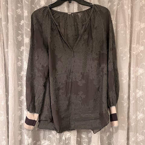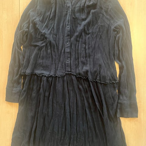 Den har rynkede detaljer og knapper foran øverst, samt lett og tynn kvalitet i stoffet. Passer til hverdagsbruk eller mer pyntede anledninger, og kan kombineres med både bukser og skjørt.