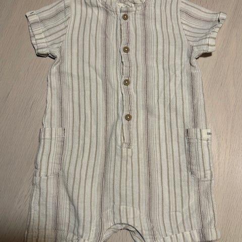 Newbie romper/playsuit for baby/barn i størrelse 80. Plagget er unisex og laget i bomull. Romperen er grønn med mønster, har korte ermer, rund hals og knepping foran med knapper. Den har lommer foran. Egner seg som hverdagsplagg for små barn. Helt ny og aldri brukt, kun vasket én gang med parfymefritt mildt vaskemiddel. Røyke- og dyrefritt hjem.