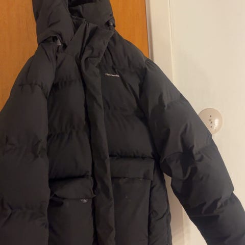 Rains dunjakke for dame i størrelse M. Jakken er svart og laget i polyester. Den har hette, gjennomgående glidelås foran og horisontale vatterte sømmer som gir et dunjakke-preg.