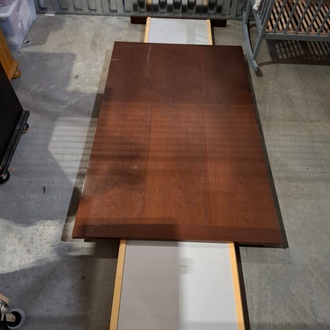 Spisebord med uttrekk og to tilleggsplater. Seks Ikea stoler følger med. Det er totalt plass til 10 personer rundt bordet