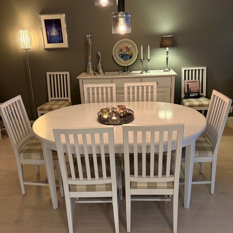 Spisebord med uttrekk og to tilleggsplater. Seks Ikea stoler følger med.