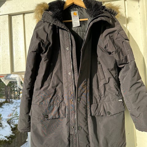 Carhartt Womens Hickman coat i marineblå i størrelse S. Det er en lett foret parkas, som passer godt til vår/høst/mildt vintervær. Den er godt brukt med normal slitasje (eks. blåfargen er litt falmet). Fortsatt mye bruk igjen 💙