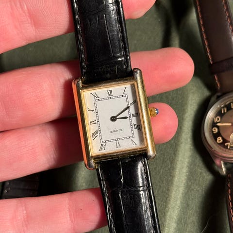 Klokken er kjøpt vintage, og kommer med en svart lizard style rem fra tissot samt en lysegrønn croc-imitasjon rem. Klokken minner noe om en tank americane fra cartier i dimensjonene.