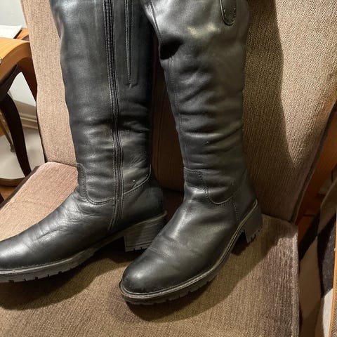 Ecco støvler i størrelse 37. Støvlene er i svart skinn med grov gummisåle og kilehæl. De har glidelås på siden for enkel av- og påkledning og reimdetalj øverst på skaftet. Passer til hverdagsbruk i kjøligere vær og gir godt grep på underlaget.