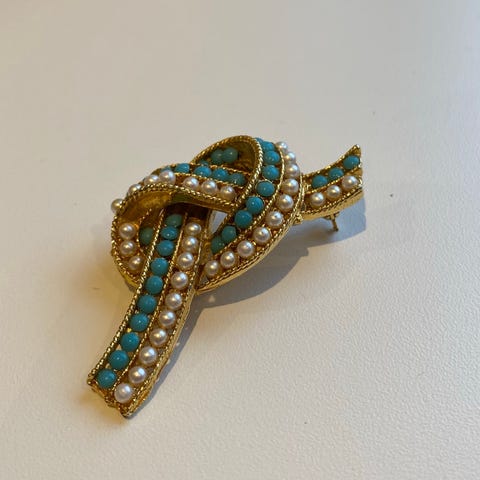 Nostalgisk nål med en sort glassperle i midten og perler og strass fordelt over nålen.