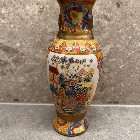 Stil og opprinnelse: Selv om stilen etterligner japansk Satsuma-porselen, er mange slike vaser produsert i Kina på 1900-tallet (ca. 1970–1980) som dekorasjonsartikler.