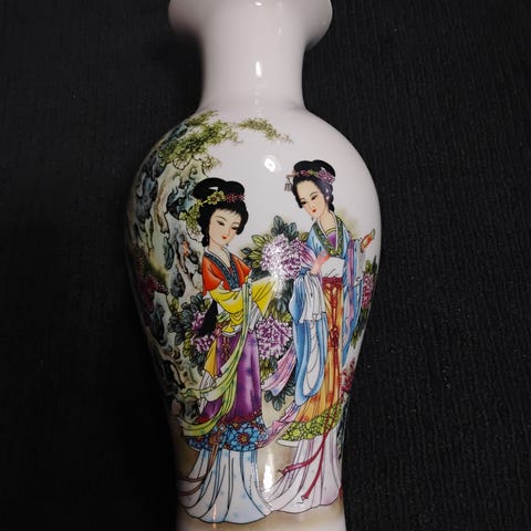 Motiv: Vasen viser en tradisjonell scene med geishaer i en hage eller et gårdsrom, ofte med landskap, fjell og blomster i bakgrunnen.
