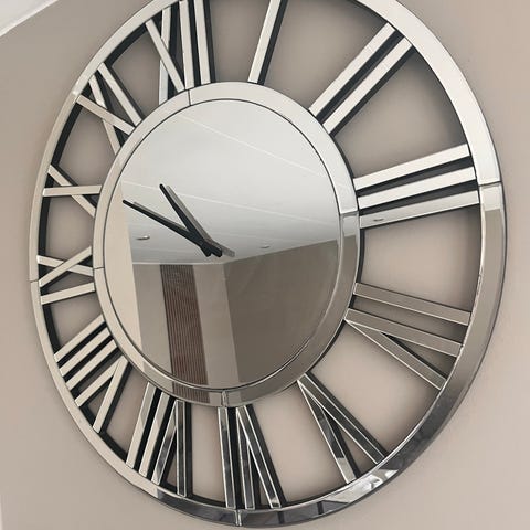 veggklokke i kvadratisk format med speilglass rundt urskiven. Klokken har tydelige svarte tall og visere på lys bakgrunn, noe som gir god lesbarhet. Egnet som veggklokke i stue, gang, kjøkken eller andre oppholdsrom der man ønsker både tidsvisning og et dekorativt element på veggen.