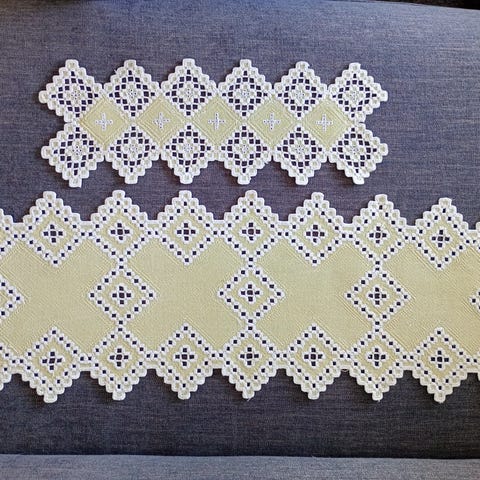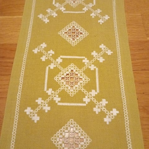 Vakker håndbrodert løper / duk i Hardanger søm. Brodert på bomull stoff i bege farge med hvit. Den er ny. Jeg sender gjerne men kjøper må betale for frakt.