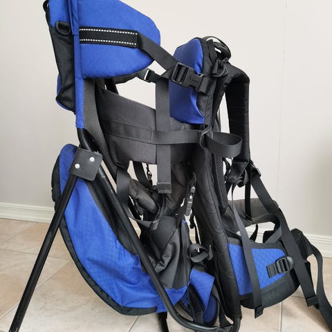 Bergans bæremeis i blå farge. Bæremeisen har polstret rygg og skulderstropper for bæreren, samt justerbare stropper og seler for barnet. Solid ramme med støtteben gjør at bæremeisen kan settes fra seg på gulv eller bakken.