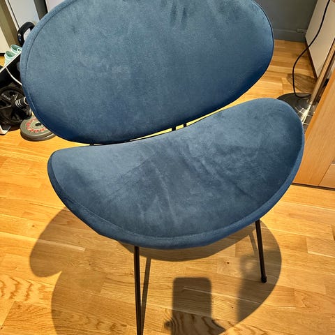 Blå velur (fløyel). Lounge-lenestol, messingben