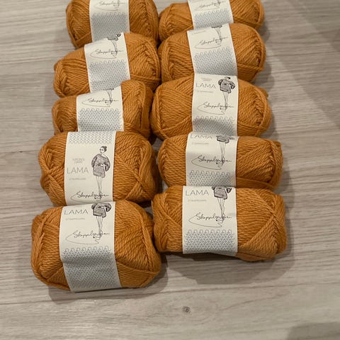 10 nøster Sandnes Garn Lama garnnøster i blandede farger, blant annet lys rosa og okergul. Garnet er et klassisk håndstrikkegarn som egner seg til ulike strikkeprosjekter som gensere, jakker, luer og skjerf. Nøstene veier 50 gram hver og har en lengde på ca. 87 meter per nøste, ifølge banderolen. Vaskes separat etter vaskeanvisning på etiketten. Garnet er produsert av Sandnes Garn i Norge.
