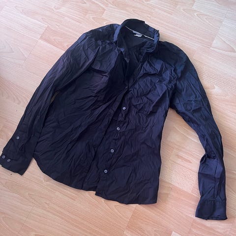 H&M skjorte for dame i størrelse M. Skjorten er svart og laget av polyester. Modellen har lange ermer, klassisk krage og knappelukking foran med en dekorativ knapp øverst. Stoffet fremstår lett og glatt, egnet til både hverdagsbruk og mer formelle anledninger. Kan brukes alene eller under blazer eller genser.
