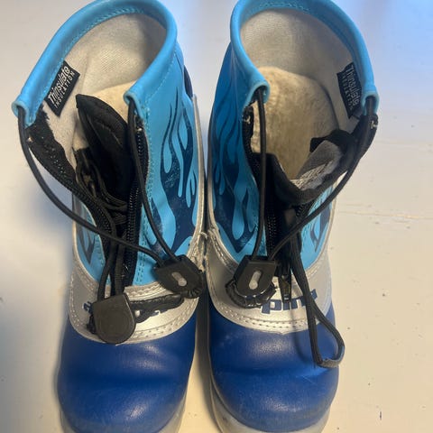 Alpina Frost skisko str 29 i blå og sølv farge. Modellen har snøring med strammesystem foran og overtrekk som beskytter mot snø og fukt. Skoene har høy ankelstøtte og polstret innside for bedre komfort.