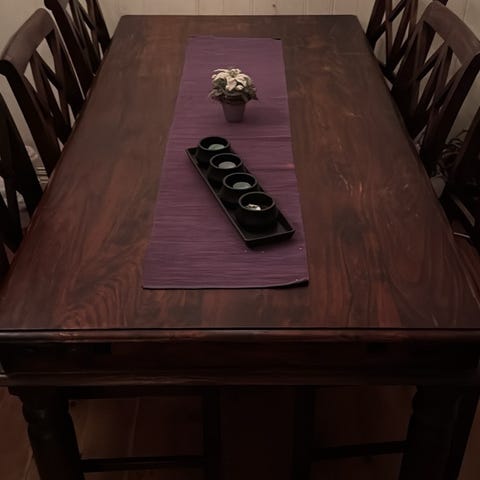 Godt brukt. Noen småskader på overflaten på bordet, se bilder. Bunnlistene på stolene bør nok limes fast i beina på nytt på enkelte.