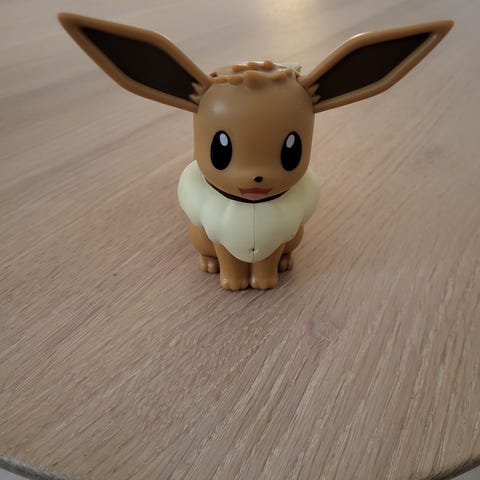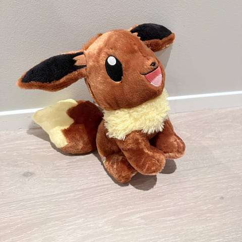 Pokémon Eevee kosedyr i mykt stoff. Figuren forestiller Eevee i brun farge med lys pelskrage og lys tupp på halen. 17 cm høy