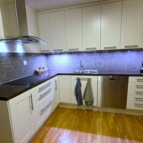 Kjøkkeninnredning med integrert stekeovn, platetopp, ventilator og vaskemaskin
