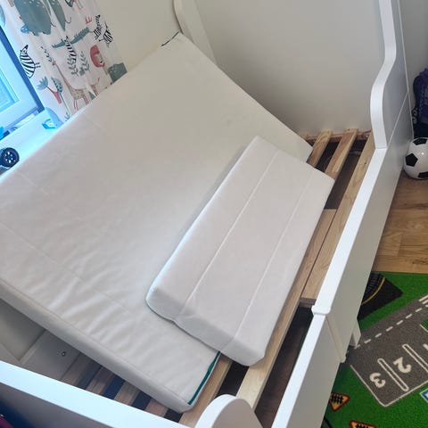 IKEA barneseng med madrass i hvit farge. Sengen har sengebunn med lameller i tre. Madrassen er delt i to deler, en hovedmadrass og en mindre tilleggsdel, som passer til barneseng. Egnet som seng til barn på barnerom.
