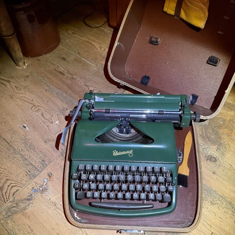 Rheinmetall mekanisk utførelse. Klassisk bordmodell med fullt tastatur og vogn for papirinnmating. Tekst på front viser produsent Rheinmetall-Borsig A.G. Skrivemaskinen er egnet for manuell skriving av dokumenter, notater og brev, og kan også brukes som samlerobjekt eller dekorasjon.