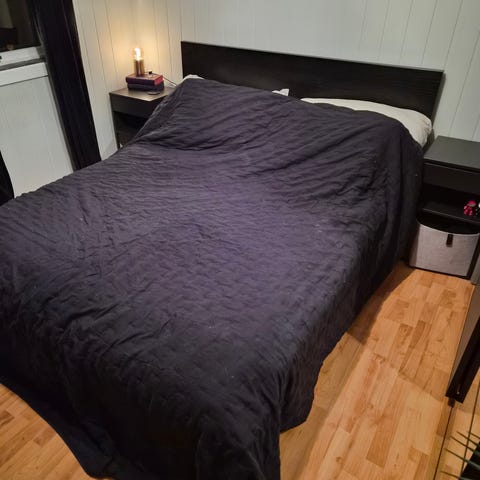 Svane seng 150x200. Høyde gavel fra gulv 100 cm. Høyde på seng fra gulv 58cm. Farge seng mørk grå.