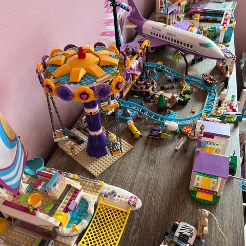 En kasse med LEGO Friends og en haug av tegninger