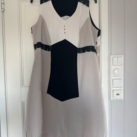 Joseph Ribkoff hverdagskjole i størrelse M. Kjolen er flerfarget med svart og hvitt paneldesign og dekorative snøredetaljer foran ved skuldre og midje. Materiale i polyester med strukturert mønster i det lyse feltet. Ermeløs modell med rund hals. Egner seg som hverdagskjole eller til enkle, pene anledninger.