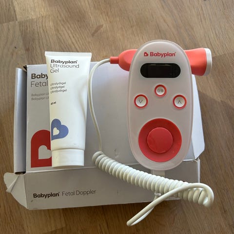 AngelSounds Fetal Doppler fosterlydsmonitor i hvit og rosa. Håndholdt enhet med separat ultralydprobe tilkoblet med spiralformet kabel. Enheten har display og betjeningsknapper på forsiden, samt høyttaler. Brukes til å lytte til fosterlyd. Drives av batteri (opplysninger om batteritype står på baksiden av enheten). Passer for privat bruk i hjemmet eller som ekstra lytteutstyr ved graviditet, innenfor gjeldende anbefalinger for bruk av ultralydutstyr.