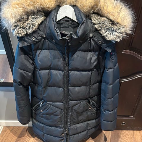 Chiara Forthi ytterjakke for dame i størrelse 36. Jakken er svart og laget i polyester. Den har vattert, quiltet design og hette med pelskant. Lukkes med glidelås og trykknapper foran, og har lommer i sidene. Passer som varm ytterjakke i kaldere vær. Jakken har dunfyll.