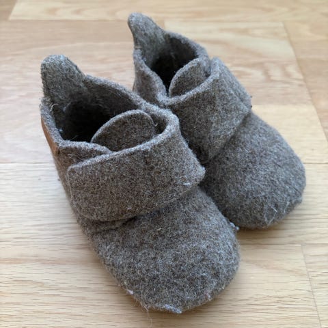 Myke og varme ulltøfler fra Bisgaard. Sitter godt på foten med borrelås og har antiskli under sålen.