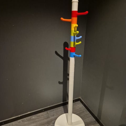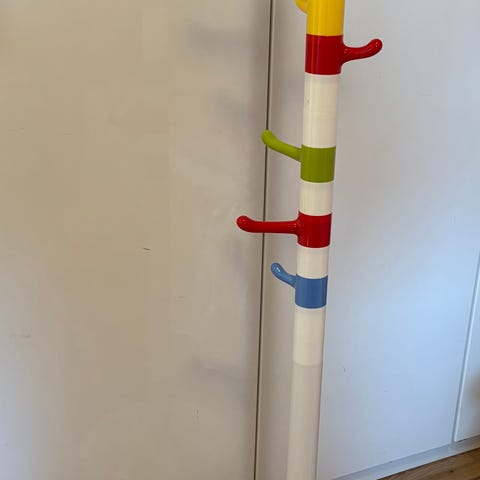 IKEA KROKIG stumtjener for barneklær i fargerik utførelse. Frittstående modell med rund fot og flere knagger i ulike høyder som passer for barn. Stumtjeneren har hvit stamme med knagger i turkis, gul og lysegrønn farge. Egnet til oppbevaring av jakker, sekker og annet yttertøy på barnerom eller i gang.