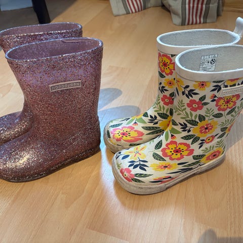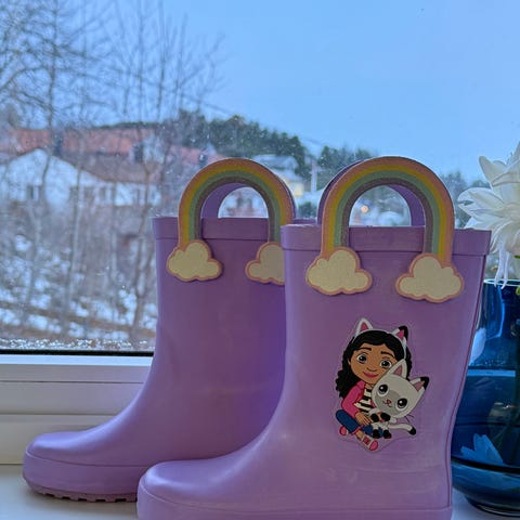 H&M gummistøvler for barn, størrelse 27. Støvlene er i lilla farge og laget i vanntett materiale som passer til bruk i regnvær og vått underlag. Modellen har hemper øverst som gjør dem enkle å ta av og på. På siden er det bilde av Gabby og regnbue. Sålen har mønster for bedre grep på glatte underlag.