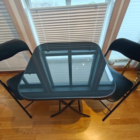Et glassbord (130/80) og fire svarte stoler, Jeg kan hjelpe med transport:)