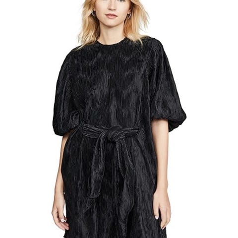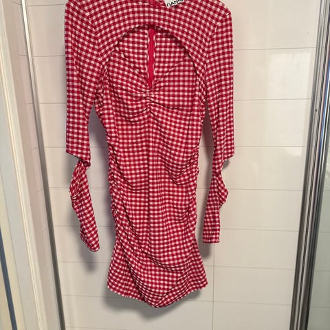 Ganni festkjole for dame i størrelse M. Kjolen er svart og laget av polyester. Den har v-hals, lange ermer og strukturert blomsteraktig mønster i stoffet. Glidelås i ryggen for lukking. Passer til bruk ved fest og andre anledninger der en pen kjole er ønsket.