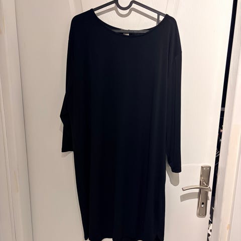 Kjolen er svart og laget av bomull. Modellen har en enkel, rett passform med halvlange ermer. Passer som en basic hverdagskjole som kan brukes alene eller lag-på-lag med strømpebukse eller bukse under.