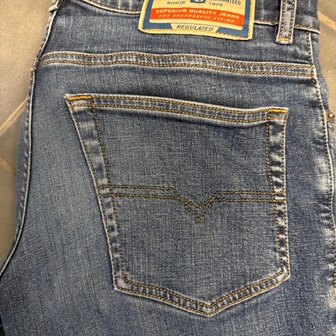Diesel jeans for herre i blå denim. Buksen har livvidde W32 og Lengde 34, og er merket i størrelse M. Brukt to dager. Passer til hverdagsbruk og kan kombineres med både t-skjorte, skjorte og genser.