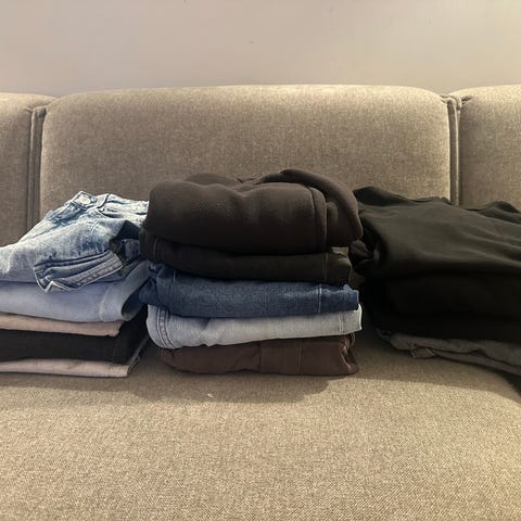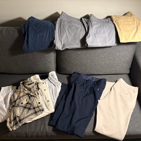 Bukser, skjorte, t-skjorte og shorts fra størrelse 152 til 176. Selges alt som er på bilde som en pakke.
