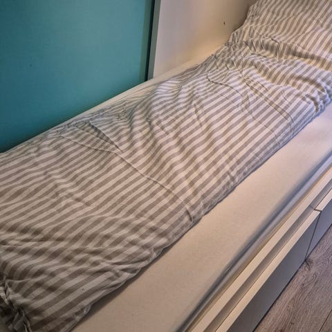Jysk seng i grått tekstiltrekk. Som ny - stått på et gjesterom. Sengen står på metallben og har en enkel, rektangulær utforming. Passer som enkeltseng eller dagseng i soverom, gjesterom eller oppholdsrom. Ytterstoffet er i tekstil.