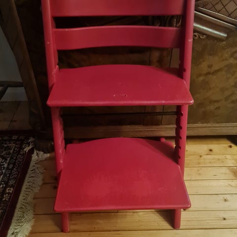 Stokke barnestol med polstret sete i grå tekstil. Stolen har integrert sikkerhetssele og hvit bøyle foran. Egnet for små barn som trenger støtte ved sitting. Passer som ekstra stol hjemme, ved bord eller som hvilestol for barn, avhengig av kompatibilitet med annet Stokke-utstyr som brukeren har fra før.