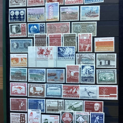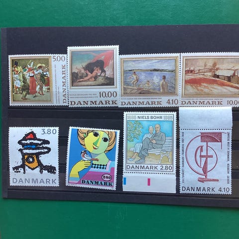 Samling med danske frimerker med portrettmotiv. Frimerkene har pålydende verdier 2,80, 2.80, 3,80 og 30, alle merket «Danmark». De er stemplet/brukte og viser ulike portretter i hovedsak i røde og blå toner. Egner seg som tillegg i frimerkesamling eller for sortering etter motiv, verdi eller stemplingssted.