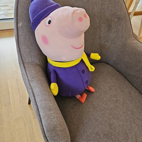 Peppa Gris kosedyr. Myke plysjfigurer fra Peppa Gris-universet, blant annet Peppa og Georg. Fantus og en enhjørning. Passer som lekekosedyr eller pyntegjenstand på barnerom.