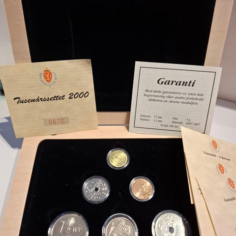 Kong Olav V mynter fra 1 øre til 5 kr, utgitt av Samlerhuset i treskrin (stygt)bl.a 5 kr 1967, usirkulert