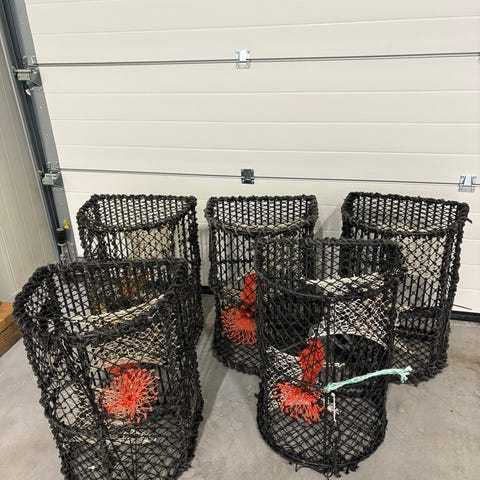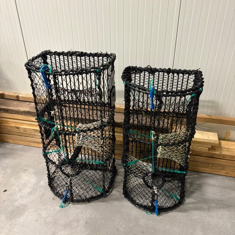 Den sorte ovale (høyre på bildet) har toppåpning, og kalver i nett. Denne har tilpasningsbare flukthull for hummer (Ø 60 mm) eller krabbe (Ø 80 mm).