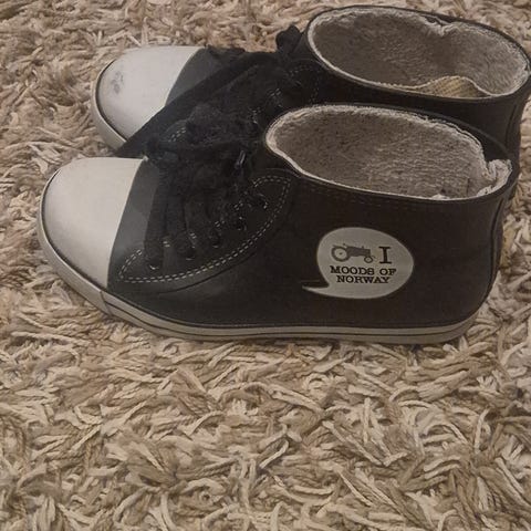 Moods of Norway regnstøvler i størrelse 35. Støvlene er i svart gummimateriale med snøring foran og mellomhøyt skaft. Sålen er mønstret for bedre grep på vått underlag. Egnet til bruk i regnvær, på tur og i hverdagen der det er behov for vanntette sko.