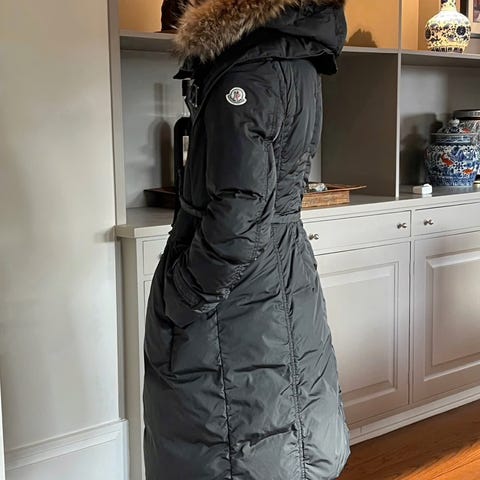 Moncler dunjakke for dame. Jakken er mørk brun og fylt med dun. Modellen er knelang med lange ermer og glidelåslukking foran. Quiltet mønster gir jevn fordeling av dunfyllet. Egnet som yttertøy i kjøligere vær.