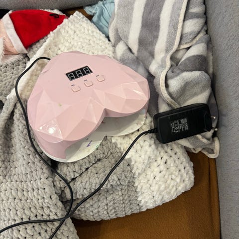 UV lampe for herding av neglelakk eller gele. Enheten har hvitt plastkabinett og strømledning med støpsel for tilkobling til stikkontakt. På toppen er det av/på‑knapp og indikatorlys. Innsiden har UV‑rør og uttrekkbar bunnplate for enkel plassering av hånden. Egnet til bruk ved manikyr og pedikyr hjemme eller i salong, der det er behov for UV‑herding av negleprodukter.