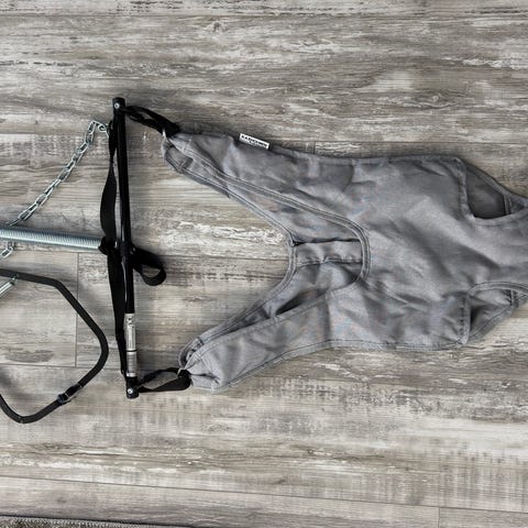 Kaxholmen hoppehuske i rød tekstil. Hoppehusken har glidelås bak og er festet til en metallramme som henges i dørkarm. Egnet for små barn som kan sitte med støtte.
